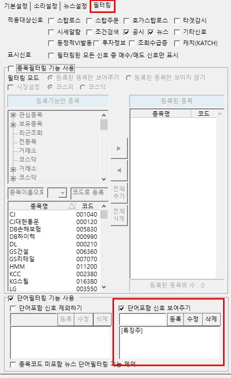 저희는 특징주 알림을 받기 위해서 특징주를 추가 해줍니다.