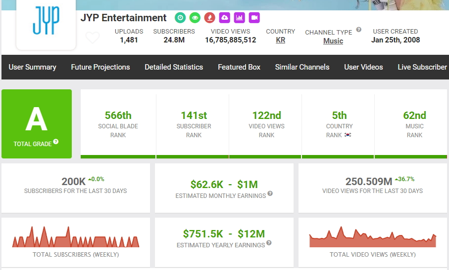 이 페이지에서는 조금 더 자세한 수치를 확인 할 수 있게 됩니다. 위 사진은 JYP 엔터 유튜브 채널의 수치 인데요. 전 세계적으로 구독자수가 몇위에 랭크 되어 있는지와 올려진 영상의 뷰 순위도 확인 할 수 있습니다. 하단의 링크는 우리나라 유튜버 구독자 순위 기준이 아닌 전 세계 유튜버 전체 순위를 확인 할수 있는 페이지 입니다. 참고 하시면 도움이 되겠습니다.